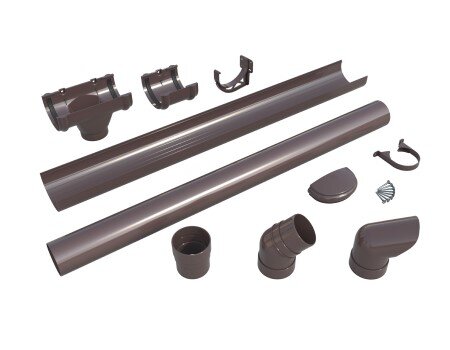 Комплектация: Желоб, 1 м - 1 шт. Желоб, 2 м - 3 шт. Соединитель желоба - 2 шт. Заглушка желоба - 2 шт. Кронштейн желоба - 11 шт. Воронка желоба - 1 шт. Труба, 2 м - 2 шт. Колено трубы 135° - 2 шт. Муфта трубы - 1 шт. Водосточный слив - 1 шт. Хомут трубы - 3 шт. Саморезы по дереву - 32 шт. Инструкция по монтажу - 1 шт.